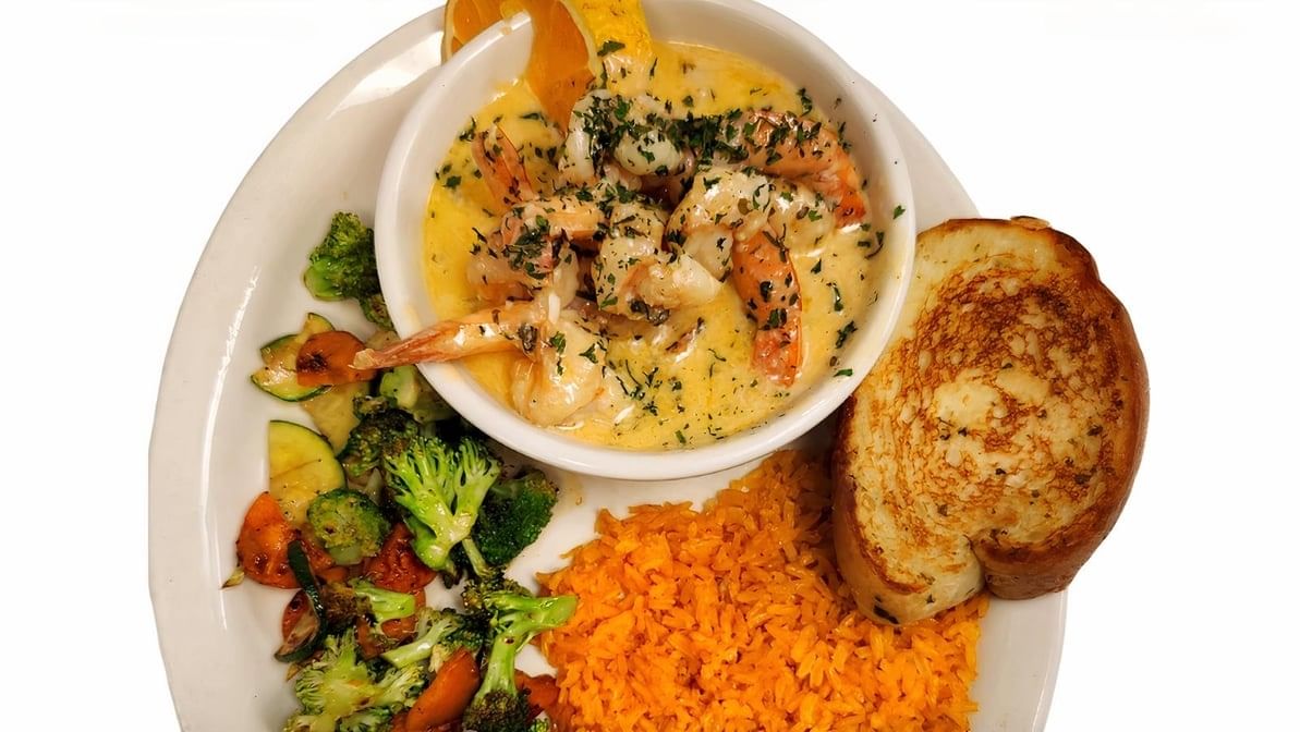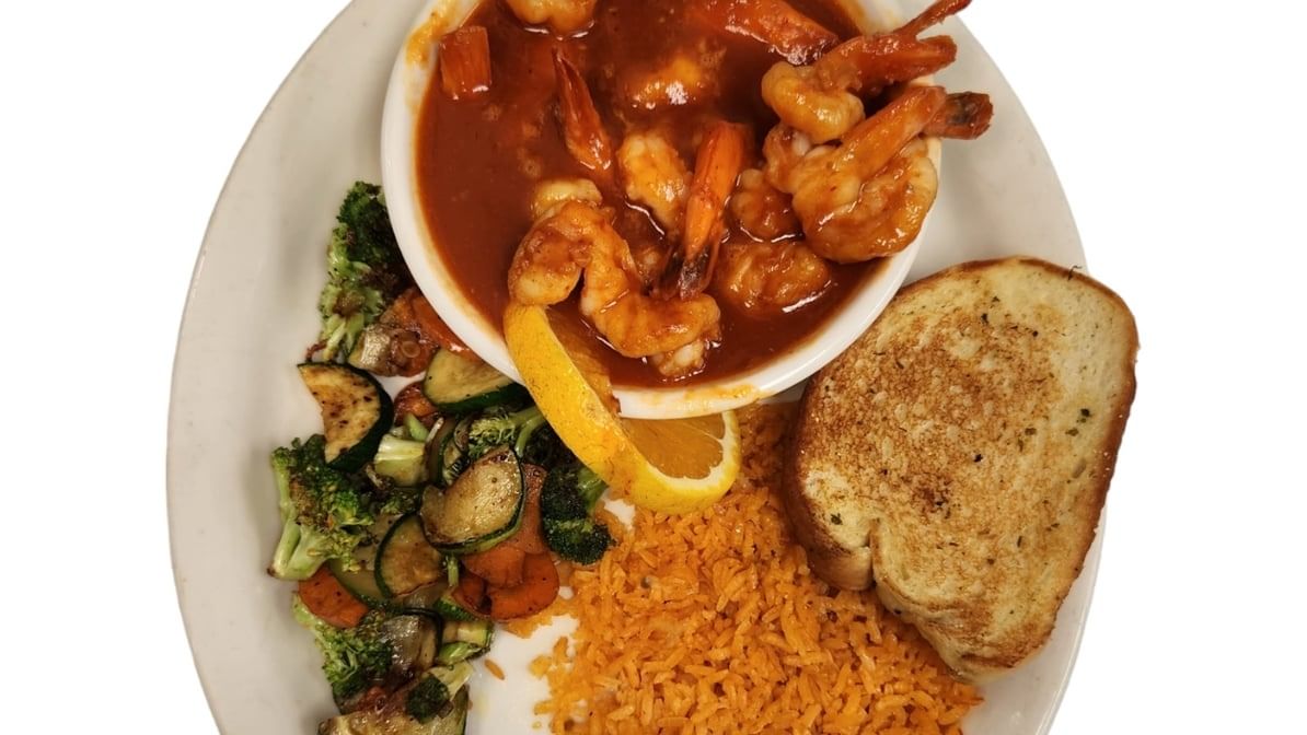 Fresh shrimp slowly simmered in special spices & garlic sauce. Served with Mexican rice and sautéed vegetables. Consuming raw or uncooked meats, poultry, seafood, shellfish or eggs may increase risk of foodborne illness especially if you have certain medical condition. We are not responsible for an individual's allergic reaction to our food or ingredients used in food items. Please be aware that there may be bones in fish fillets