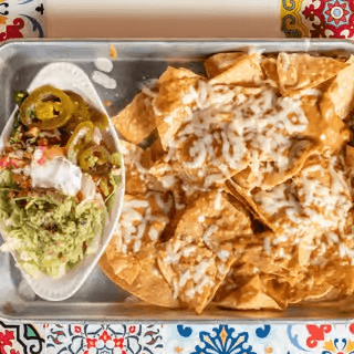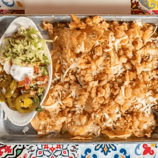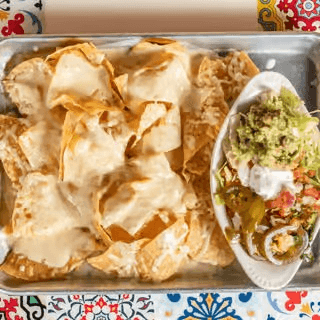 Chips topped with cheese dip served with lettuce, guacamole, sour cream, pico de gallo, and jalapeños on the side.