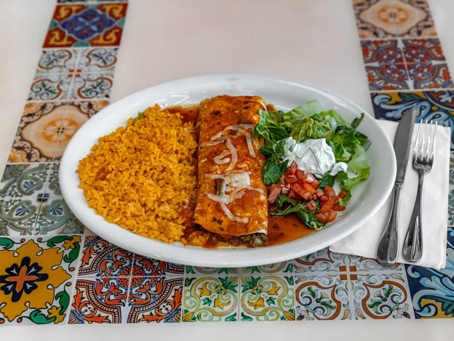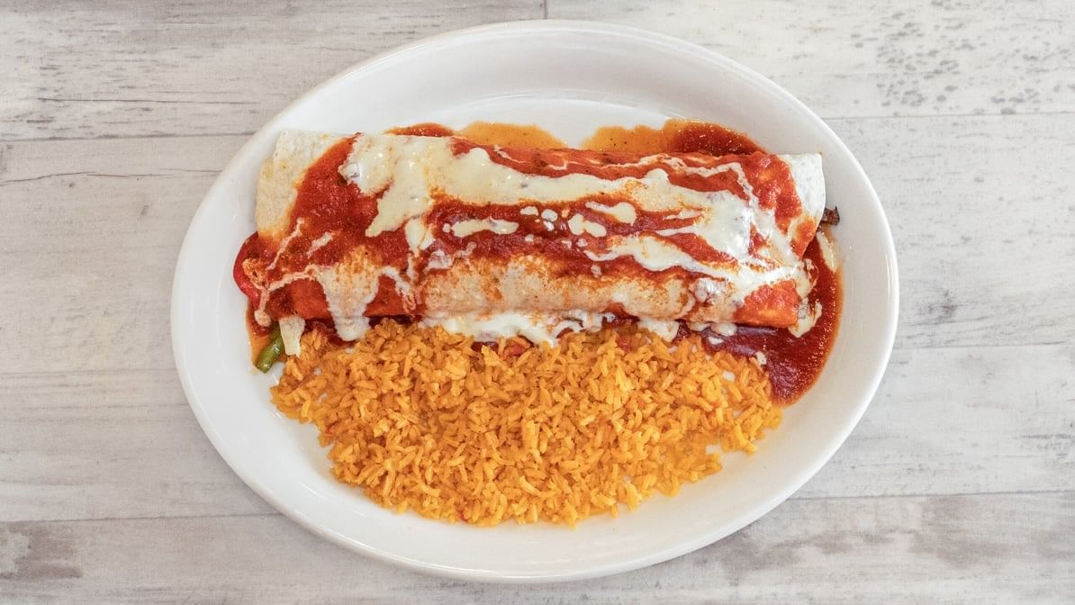 Large flour tortilla rolled with beans, bell peppers, onions, and your choice of meat, topped with red sauce. Choice of guacamole salad or rice.