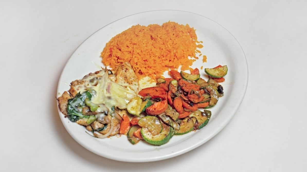 Grilled chicken breast topped with grilled mushrooms, bell peppers, onions and cheese dip served with Mexican rice and sautéed vegetables.