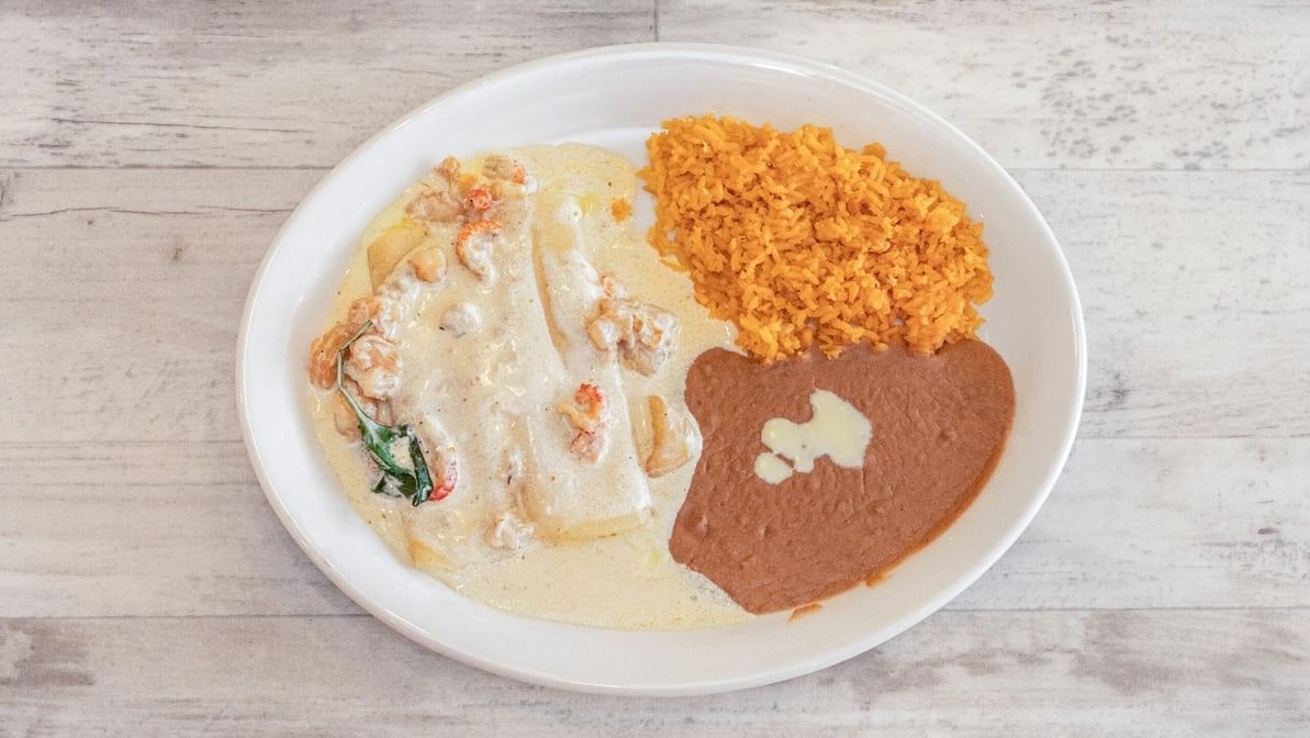 Two fresh tortillas filled with a blend of mixed cheese & topped off with shrimp, crawfish and baby spinach sautéed in a creamy seafood sauce, served with rice & refried beans.. Consuming raw or uncooked meats, poultry, seafood, shellfish or eggs may increase risk of foodborne illness especially if you have certain medical condition. We are not responsible for an individual's allergic reaction to our food or ingredients used in food items. Please be aware that there may be bones in fish fillets