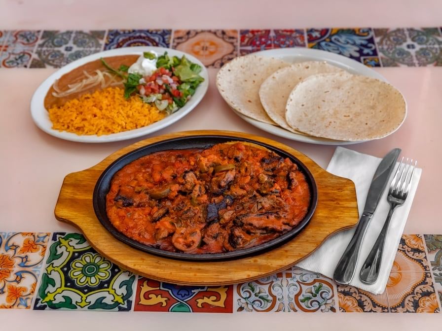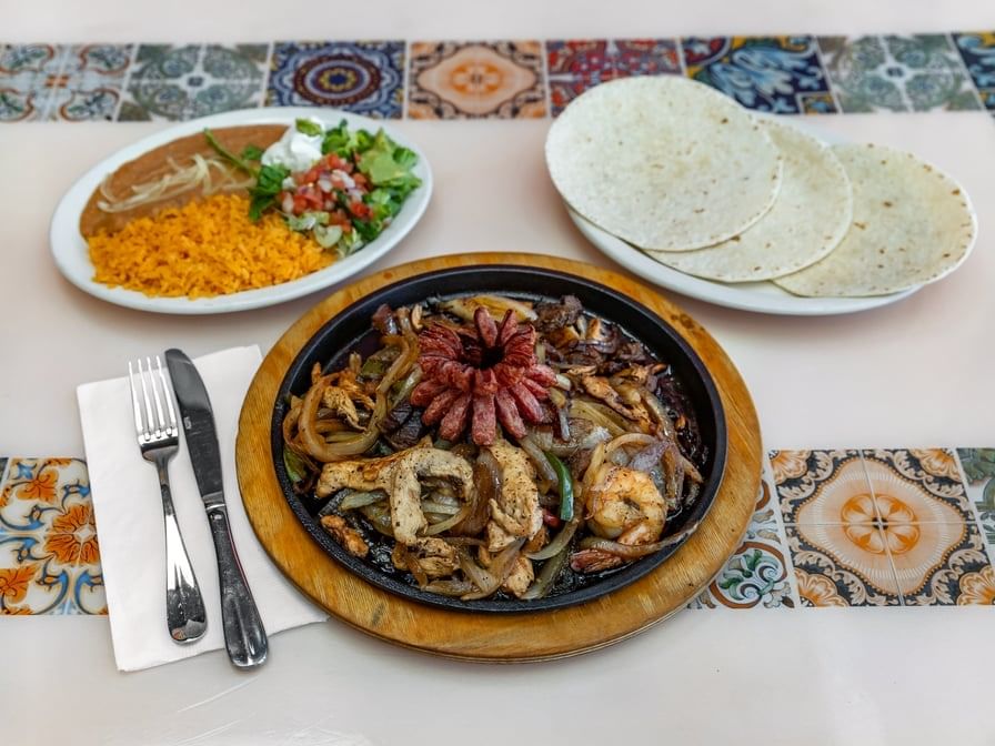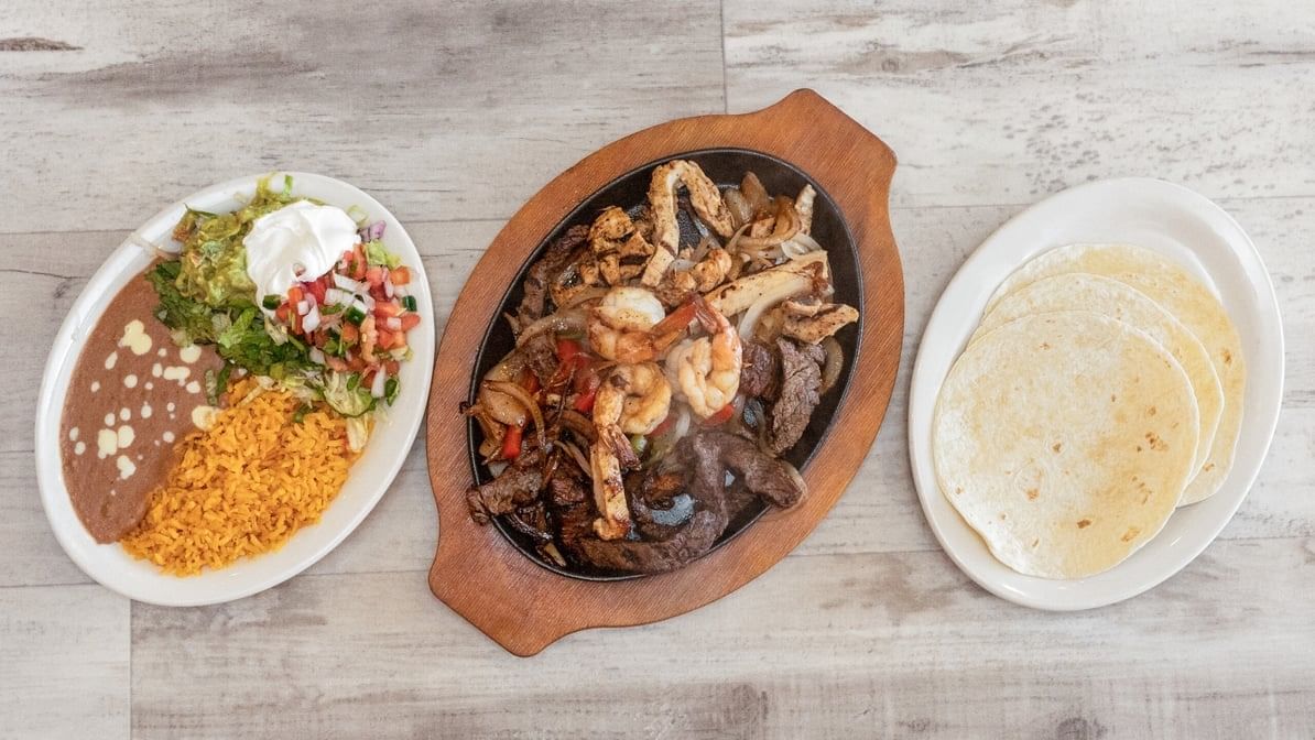 Grilled chicken, steak, shrimp and sausage. Served with tortillas, guacamole salad, rice and your choice of refried or charro beans. For 2.