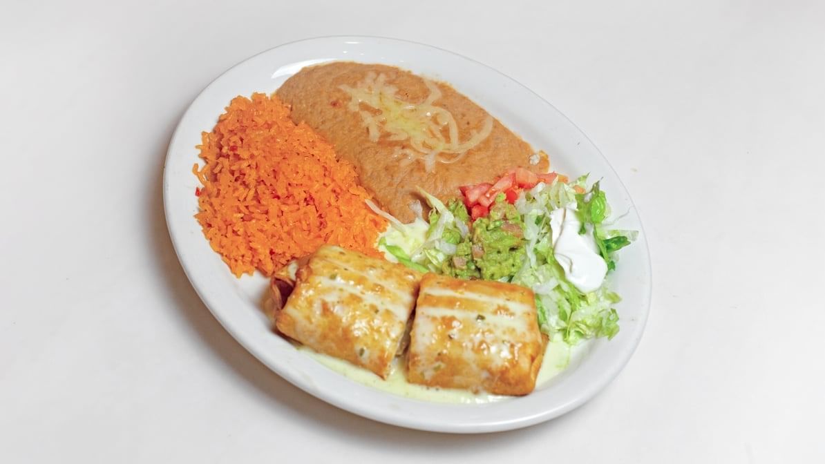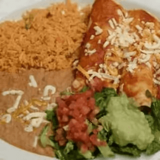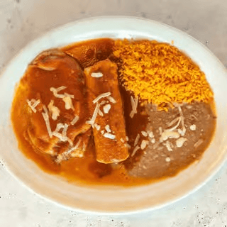 Two beef or chicken enchiladas; served with rice & refried beans, topped with red sauce.