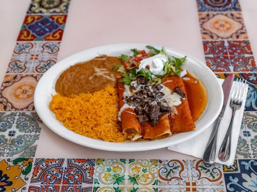 Your choice of protein served with our traditional enchilada red sauce. Beef, chicken or cheese. Steak or shrimp for an additional charge.