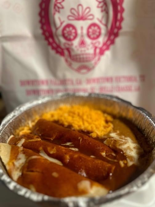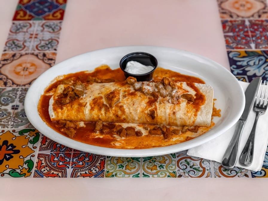 With rice & refried beans. Served with our traditional red enchilada sauce & burro sauce.