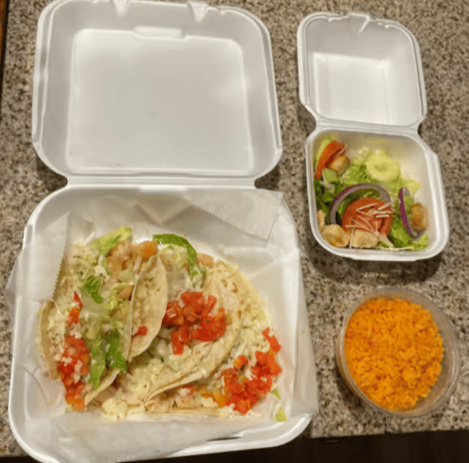 Three tacos served with rice & your choice of house salad or tortilla soup, soft or hard shell tortillas. Consuming raw or uncooked meats, poultry, Seafood, shellfish or eggs may increase risk of foodborne illness especially if you have certain medical condition. We are not responsible for an individual's allergic reaction to our food or ingredients used in food items. Please be aware that there may be bones in fish fillets