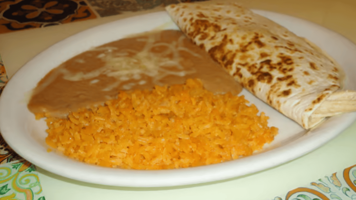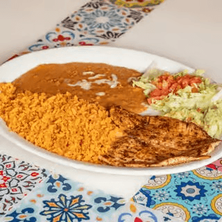 One quesadilla served with rice & beans.