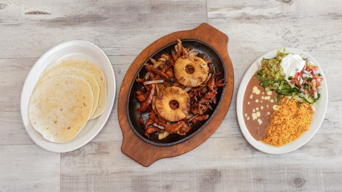Marinated pork strips in adobo sauce with pineapple. Server with rice, refried beans, guacamole salad and tortillas. For 1.