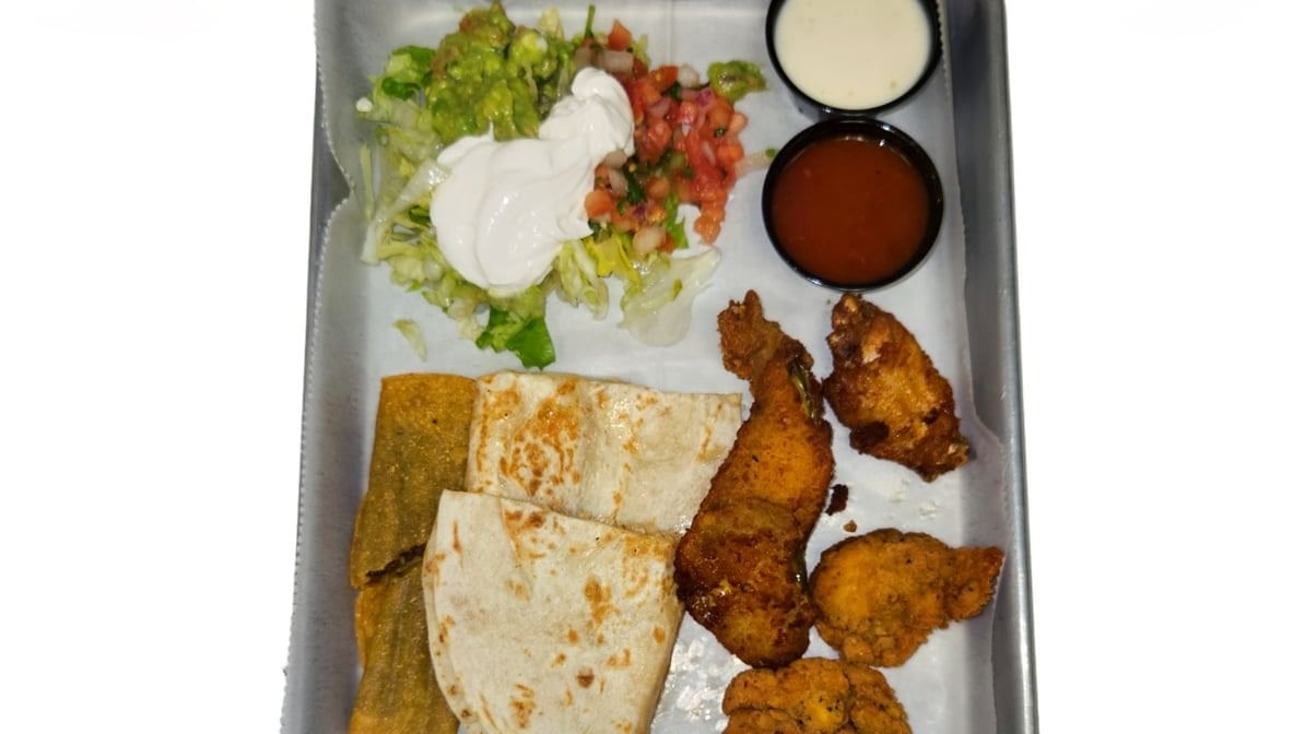 Chicken quesadilla, wings, a flauta, chicken fingers, stuffed jalapeños, guacamole & sour cream.