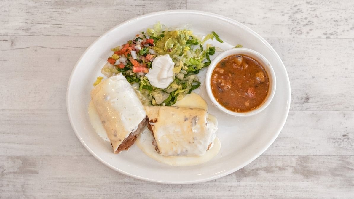 One flour tortilla rolled with ground beef & beans, topped with cheese & red sauce. Served with lettuce, guacamole, sour cream & tomatoes.