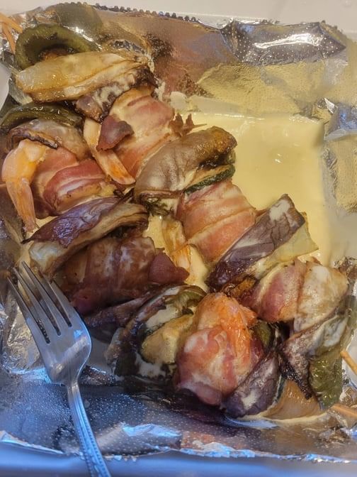 6 jumbo shrimp stuffed with cheese, wrapped in bacon, served with avocado salad & tortilla soup. Consuming raw or uncooked meats, poultry, seafood, shellfish or eggs may increase risk of foodborne illness especially if you have certain medical condition. We are not responsible for an individual's allergic reaction to our food or ingredients used in food items. Please be aware that there may be bones in fish fillets
