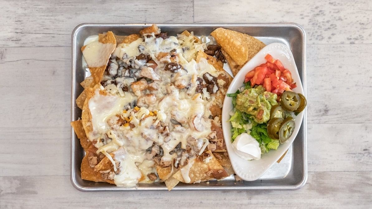 Grilled chicken, shrimp, steak & beans topped with cheese dip served with lettuce, guacamole, sour cream, pico de gallo, and jalapeños on the side.