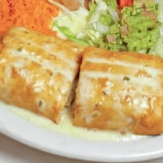 Golden brown deep fried burrito served with your choice of protein served with rice, beans and guacamole salad.